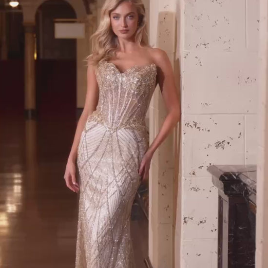 - Design: Strapless sweetheart neckline with full sequin and bead embellishment