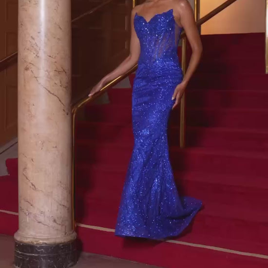 Command attention in this stunning fitted gown, featuring a strapless sweetheart neckline and a sparkling sequin bodice that blends beautifully into the flowing skirt. The sleek, body-contouring silhouette enhances your natural shape, while the lace-up corset back provides adjustable support and a perfectly sculpted fit. Finished with radiant bead detailing throughout, this dress is an unforgettable choice for prom nights, glamorous red-carpet moments, black-tie affairs, and pageant appearances.