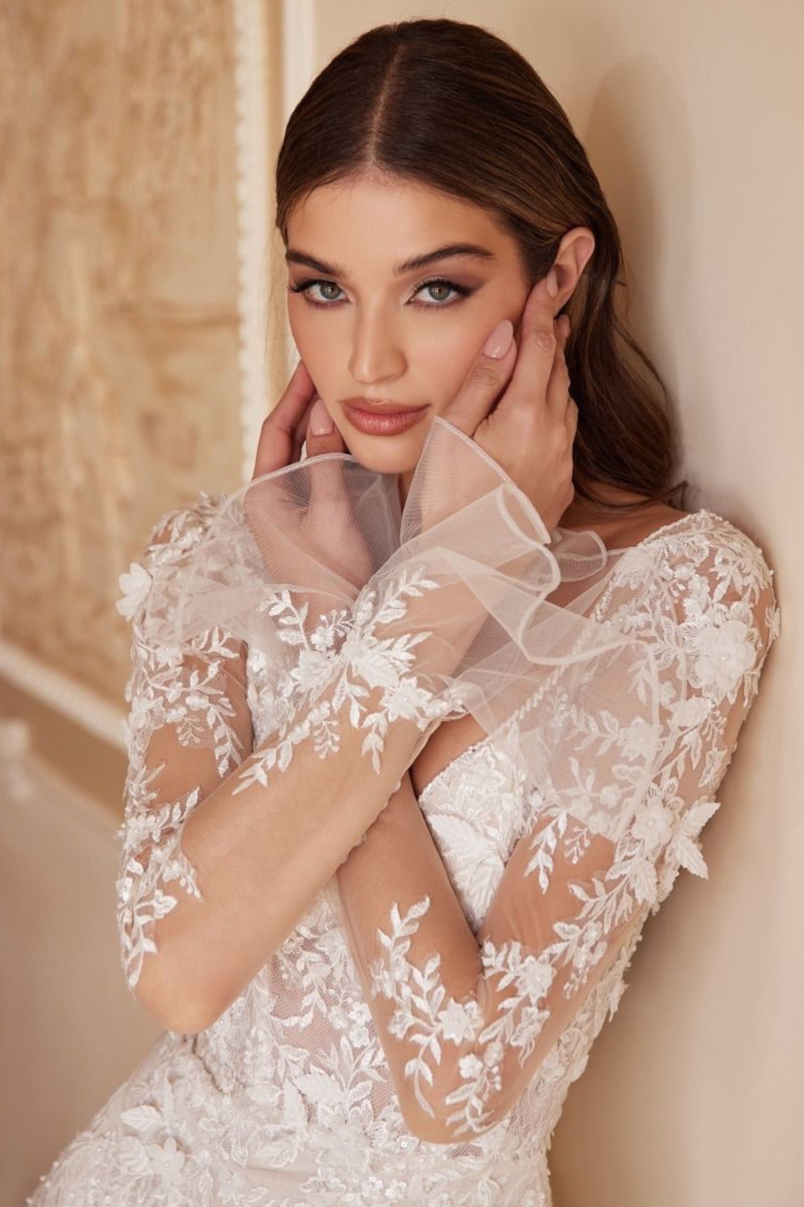 For brides seeking a touch of femininity and coverage, the dress offers sheer sleeves adorned with a ruffle cuff, gracefully enhancing the overall silhouette. The lace placement along the outer arm adds a flattering touch, accentuating your natural beauty.