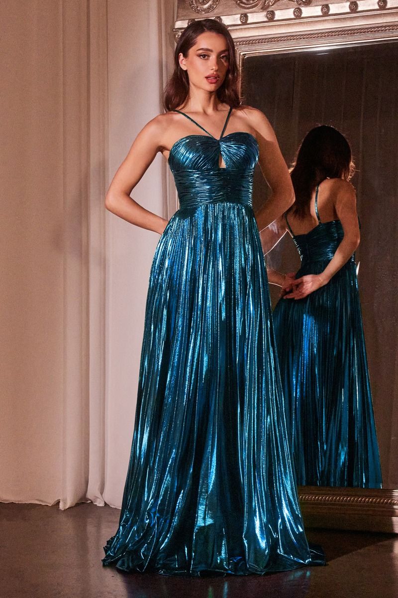 Illuminate the evening in this shimmery pleated A-line gown, a dazzling option for the contemporary woman who adores to sparkle. Constructed from a glossy metallic fabric, this dress exudes opulence with every sway. The halter neckline with a sweetheart shape adds a touch of enchantment, framing your shoulders with grace. A small cutout at the bust adds a hint of allure, striking a perfect balance between playfulness and sophistication. The gathered waistline creates a figure-flattering silhouette, allowing the pleats to cascade elegantly. This dress is more than just an ensemble; it's a jubilation of your vibrant energy and captivating allure. Whether you're attending a special occasion or a night out on the town, let this metallic masterpiece be your ultimate choice for commanding attention and emanating confidence amidst a sea of shimmering brilliance.