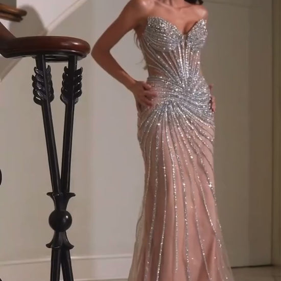 This stunning fitted gown embodies elegance with its all-over beaded craftsmanship and illusion corset-style bodice. Designed with a deep sweetheart neckline and flowing linear embellishments that beautifully highlight the figure, it delivers undeniable red-carpet glamour. Sparkling beadwork cascades over a delicate sheer tulle overlay, while the lace-up back provides a sculpted and adjustable fit. A perfect choice for prom, pageants, or any evening meant to shine.