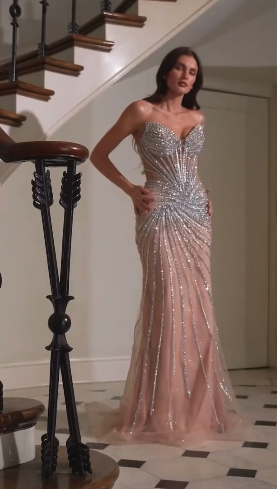 • Design: Strapless sweetheart neckline with illusion corset bodice and linear beaded embellishments