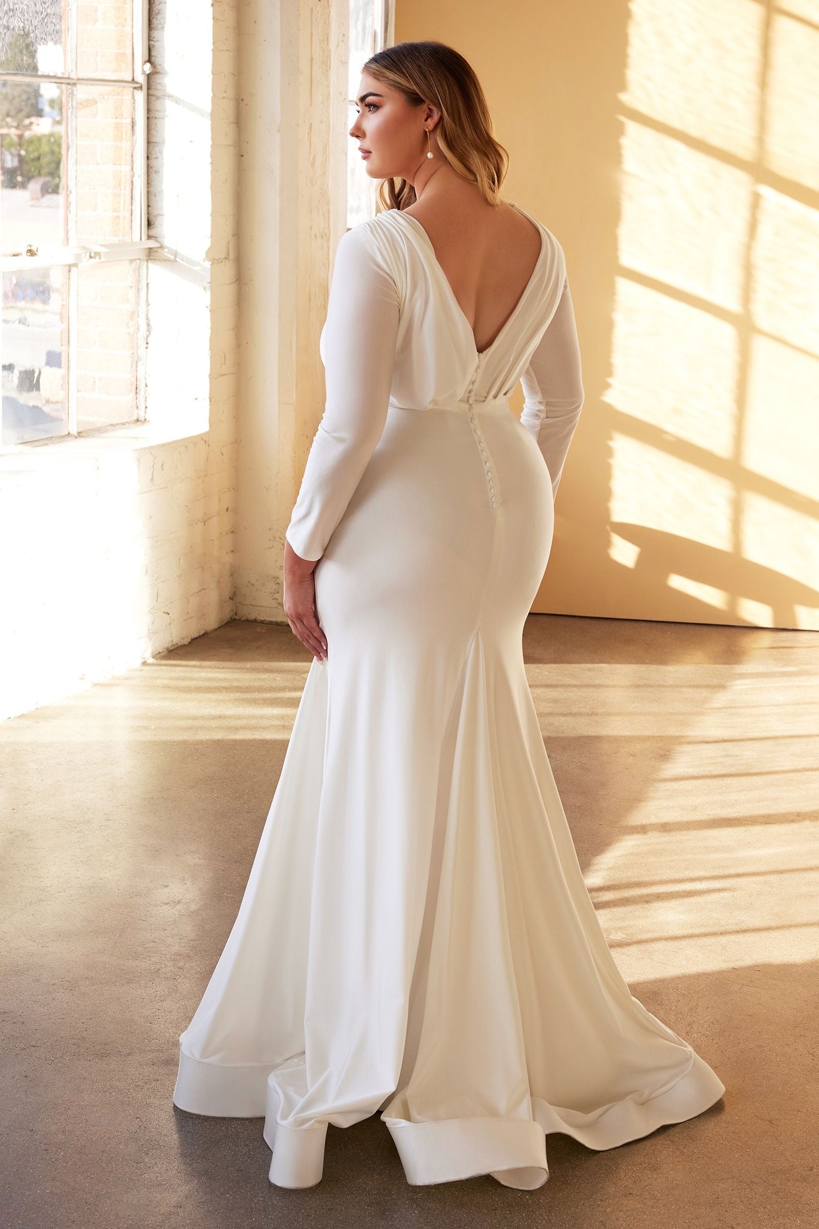 For the more modest bride, this long sleeve gown is an elegant and sophisticated choice. It is made from a smooth and lustrous stretch satin fabric, which not only looks luxurious but also ensures a flattering and close fit.