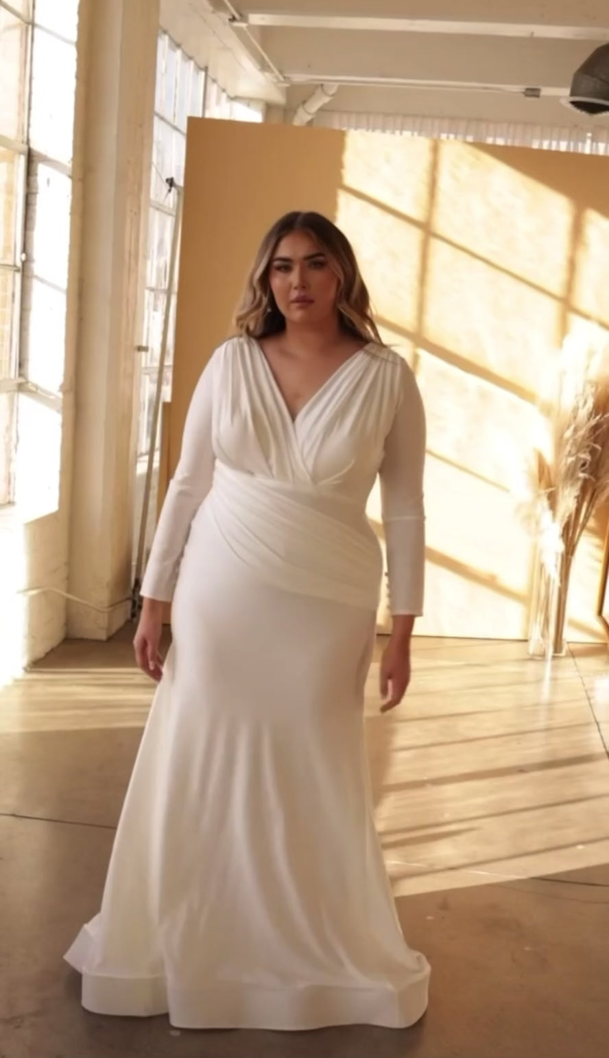 Overall, this long sleeve gown is a perfect choice for the modest bride who wants to exude elegance and sophistication on her special day. The combination of the pleated bodice, plunging surplice neckline, asymmetric waist panel, delicate covered buttons, and floaty mermaid hem creates a timeless and flattering silhouette that will make you feel beautiful and confident.